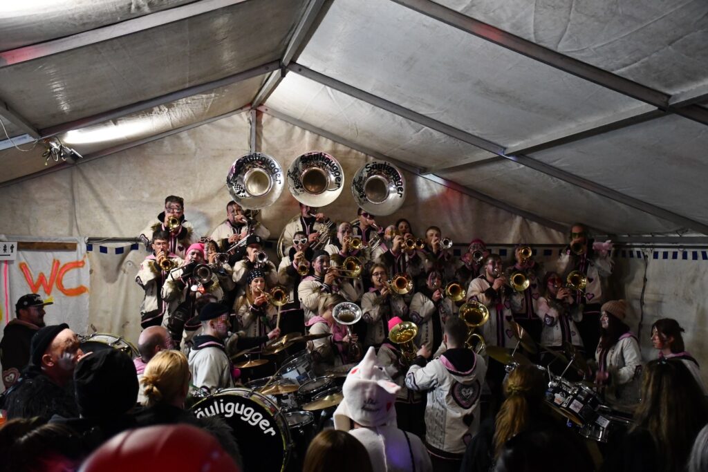 Im Gegensatz zu den letzten Jahren mit nur zwei Guggenmusiken traten an diesem Samstag, 17. Januar, im Stundentakt vier Gruppierungen auf. Dazwischen sorgte DJ Tutti für Stimmung. Den Start um 21 Uhr machten die Affoltemer Säuligugger. Diese waren schon an der Kinderfasnacht am Nachmittag im Einsatz und standen nach ihrem Auftritt in Obfelden um 1.20 Uhr auch noch am Scampiball in Zug auf der Bühne. Was für ein Programm!