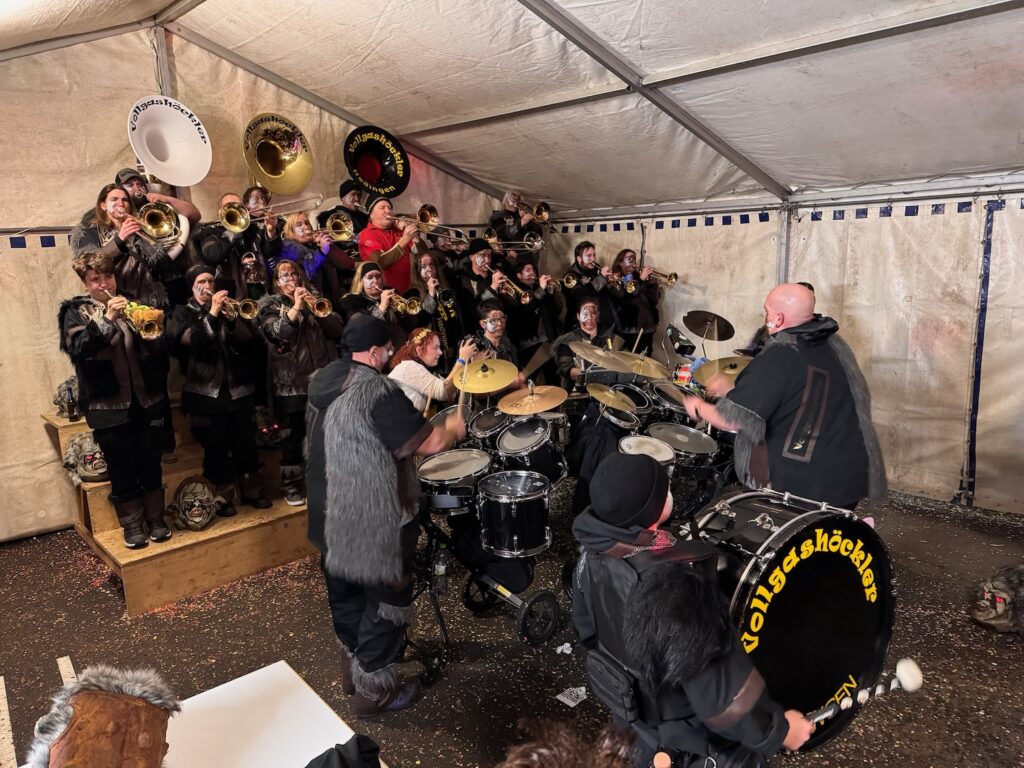 Auch die Vollgashöckler liefen schon an der Kinderfasnacht mit und spielten am Füürball um 22 Uhr. Mit dabei dort auch die Familie Meister, welche schon die ganze Organisation des Maskenballs bewerkstelligt. Die zugerischen Las Moränos und um Mitternacht die Väntilwörger aus dem aargauischen Sins komplettierten das Programm. Letztere traten mit gegen 40 Personen auf, was ziemlich beeindruckend aussah und ohrenbetäubend war.