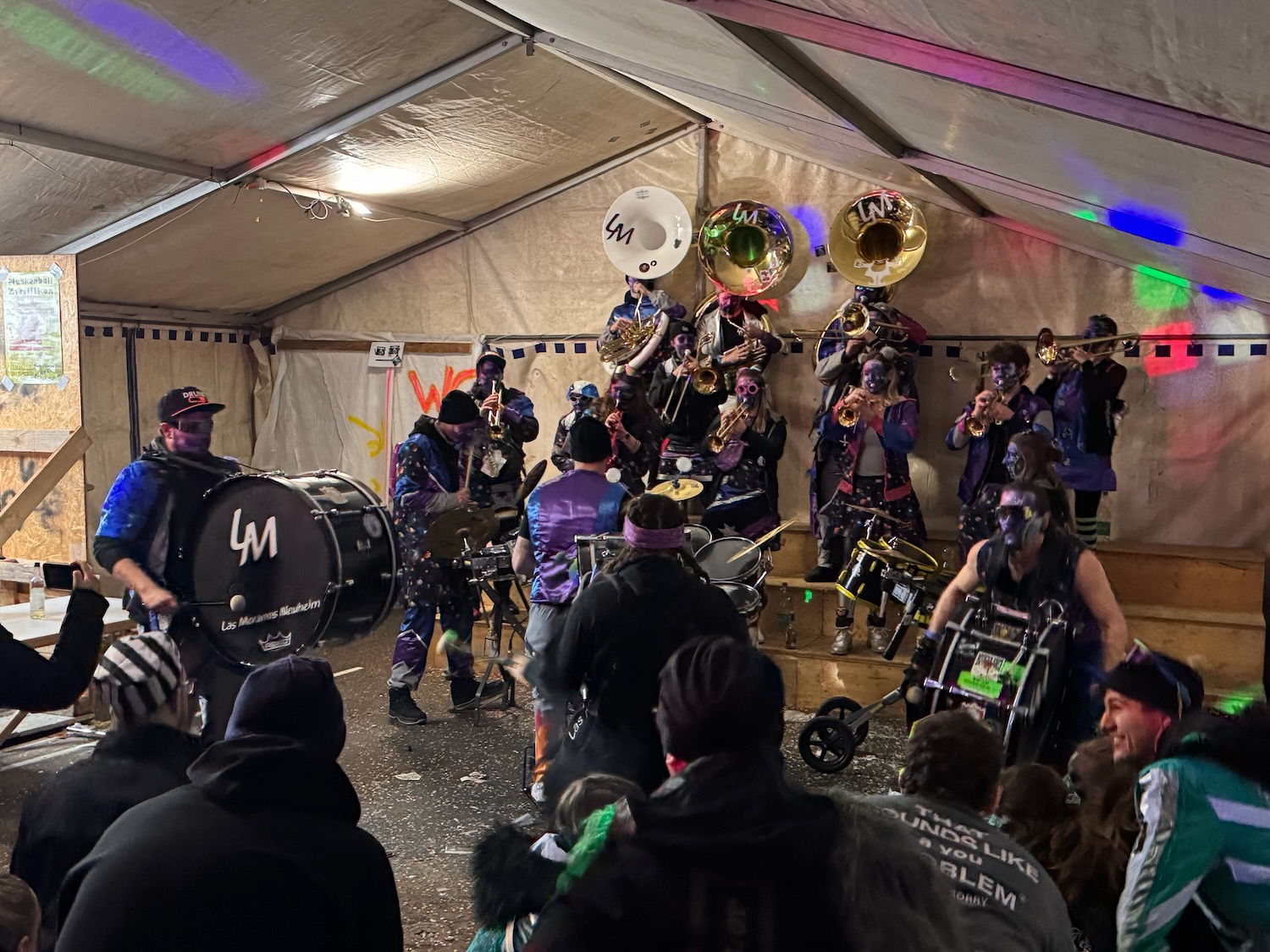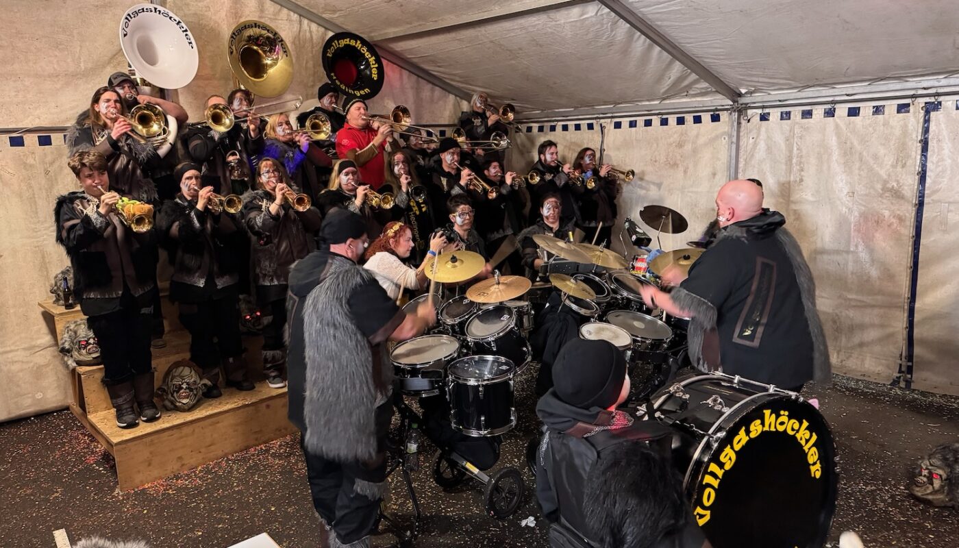 Auch die Vollgashöckler liefen schon an der Kinderfasnacht mit und spielten am Füürball um 22 Uhr. Mit dabei dort auch die Familie Meister, welche schon die ganze Organisation des Maskenballs bewerkstelligt. Die zugerischen Las Moränos und um Mitternacht die Väntilwörger aus dem aargauischen Sins komplettierten das Programm. Letztere traten mit gegen 40 Personen auf, was ziemlich beeindruckend aussah und ohrenbetäubend war.